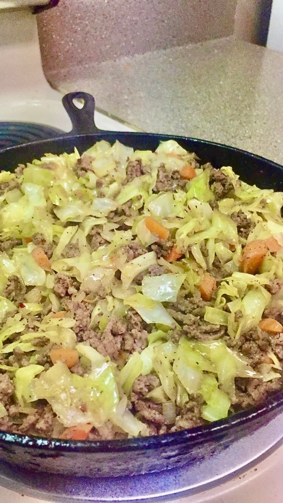Cook your veggies: I clean out the pan and start over for the veggies, but you can use the grease from the meat, if you want. I use either pam or butter for this recipe. These are much less healthy than all the other options I listed above, but if you don’t care about that, go big! (I don’t like how much I can taste the coconut flavor when I use coconut oil with cabbage, so if you don’t like coconut, do NOT use it.) Dice up your onions and carrots and chop the cabbage. Then, add everybody to the pot. (Usually I add the onions, first, honestly.) Anyway, season the veggies. I use black pepper and coconut aminos, here. I don’t use much salt because the coconut aminos usually have plenty sodium. After, stir and let everybody cook down together until the onions are clear and the cabbage is browned.
