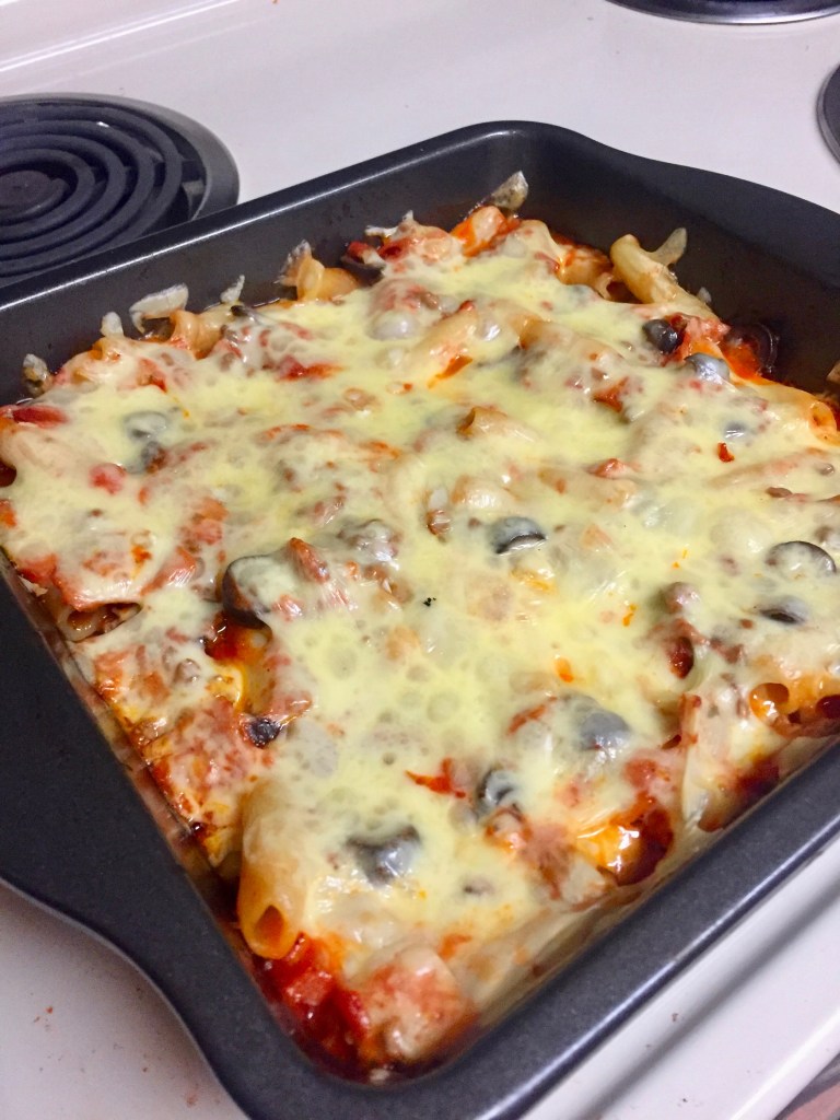Combine the pasta, cooked beef, sauce, pepperoni, olives, and jalapeños in a pot on a medium heat level. Simmer. You can do this in the same pot you cook the pasta in, if its big enough. Once everything has warmed together, add about half of your cheese to the mixture and stir. Next, pour it into a 13×9 inch glass or nonstick pan. Top with the remaining cheese. Put the pan in the oven. Bake until cheese to nice and melty- that’s about 30 minutes.